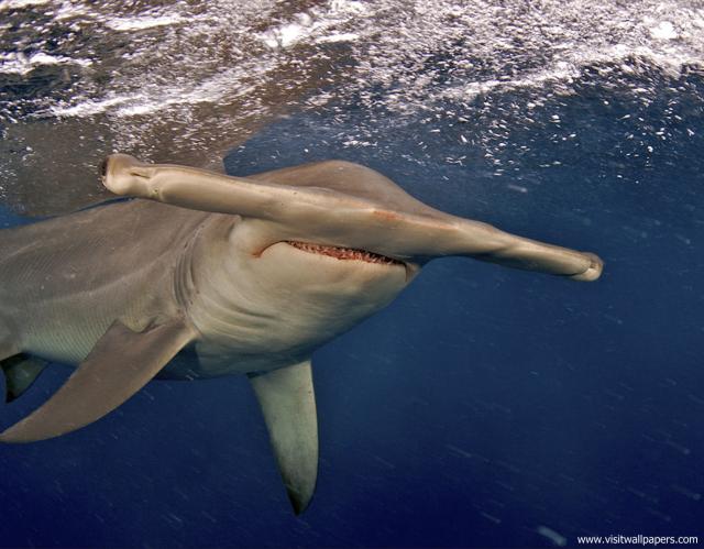ocean-life-816Ocean shark bottom view from below. Open toothy dangerous mouth with many teeth. Underwater blue sea waves clear water shark swims forward