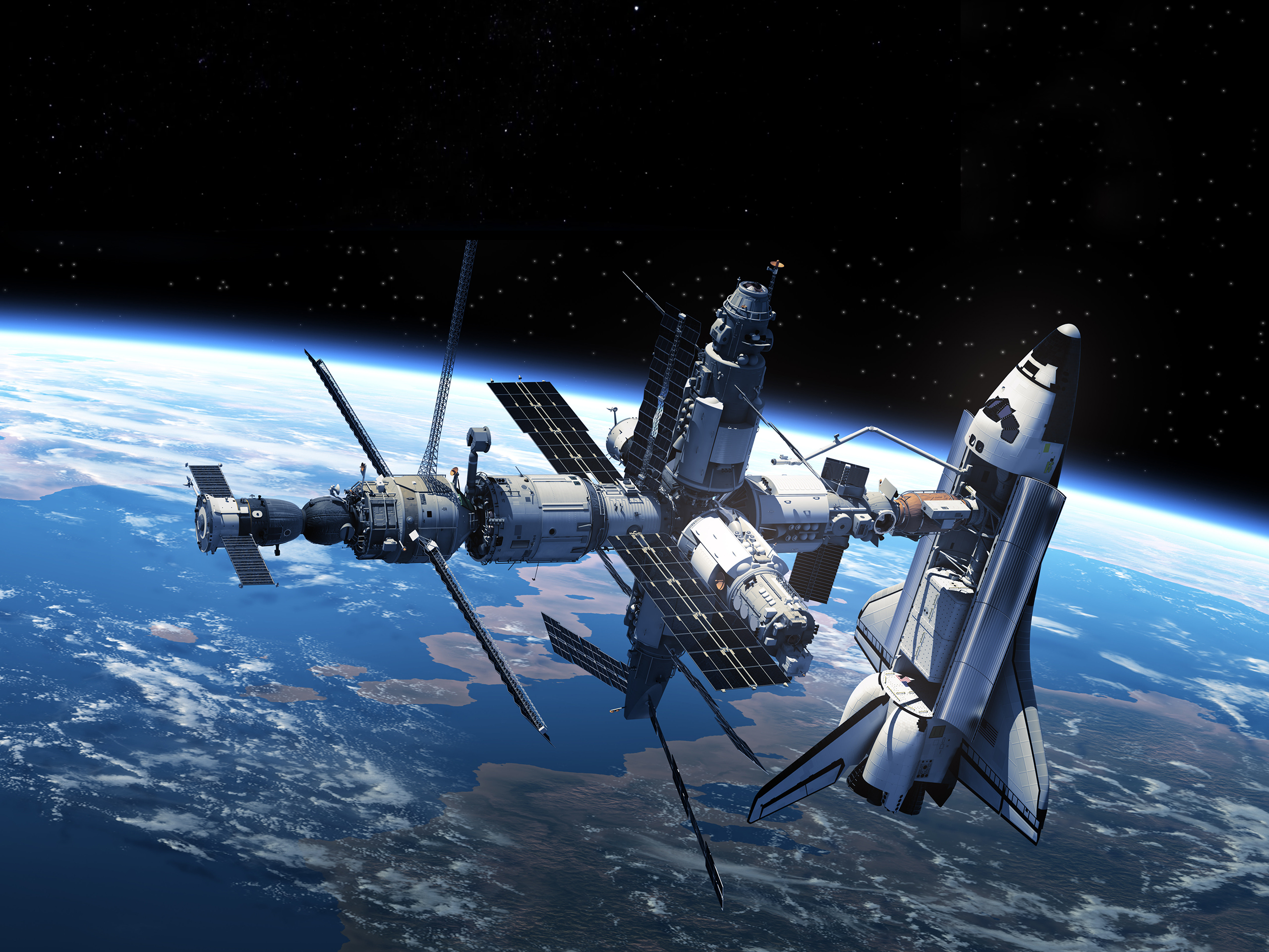 sci-fi_101Space Shuttle And Space Station In Space. 3D Scene.