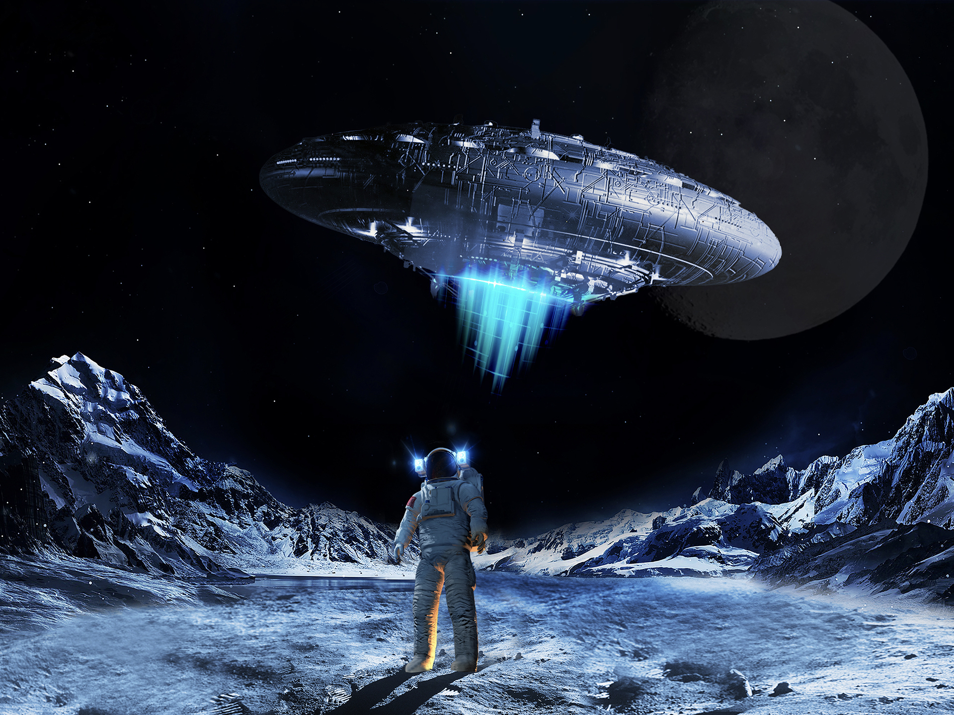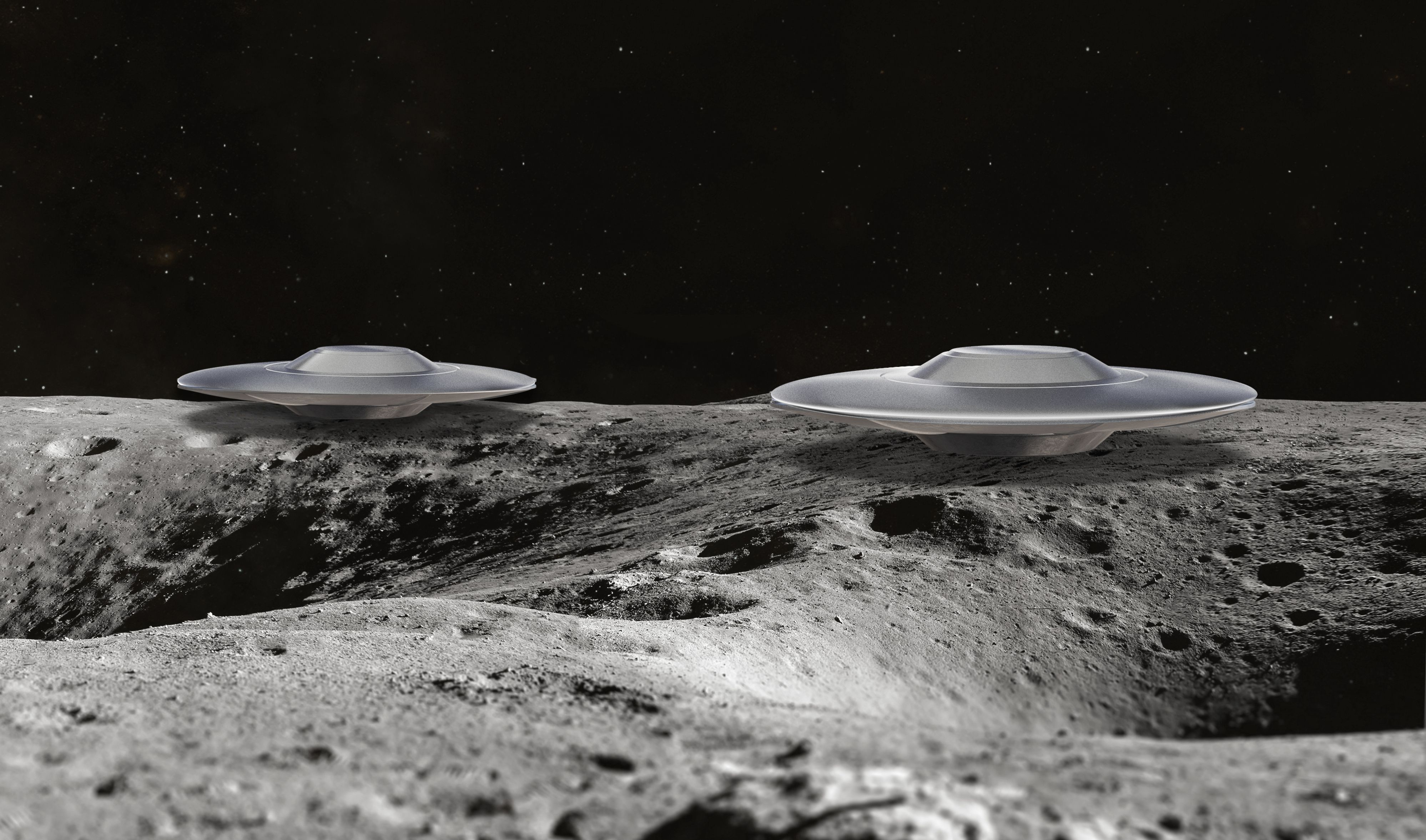 3d illustration of UFOs on the Moon.