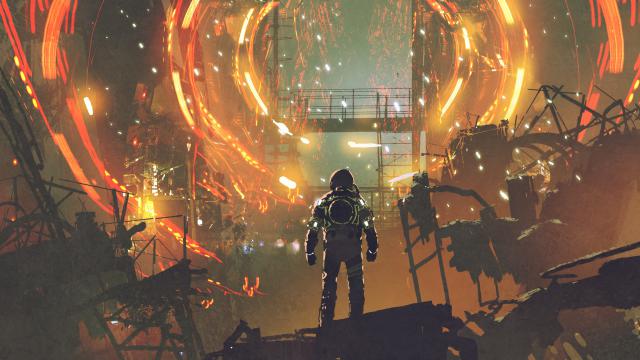 astronaut sci-fi scene looking at futuristic portal, digital art, illustration painting