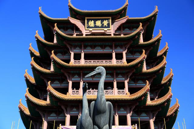 china_902Aerial view of Wuhan city. Panoramic skyline and buildings beside yangtze river. The yellow crane tower, located on snake hill in Wuhan, is one of the three famous towers south of yangtze river, China. 4 Chinese letters on tower is "Nang Xiong Gao