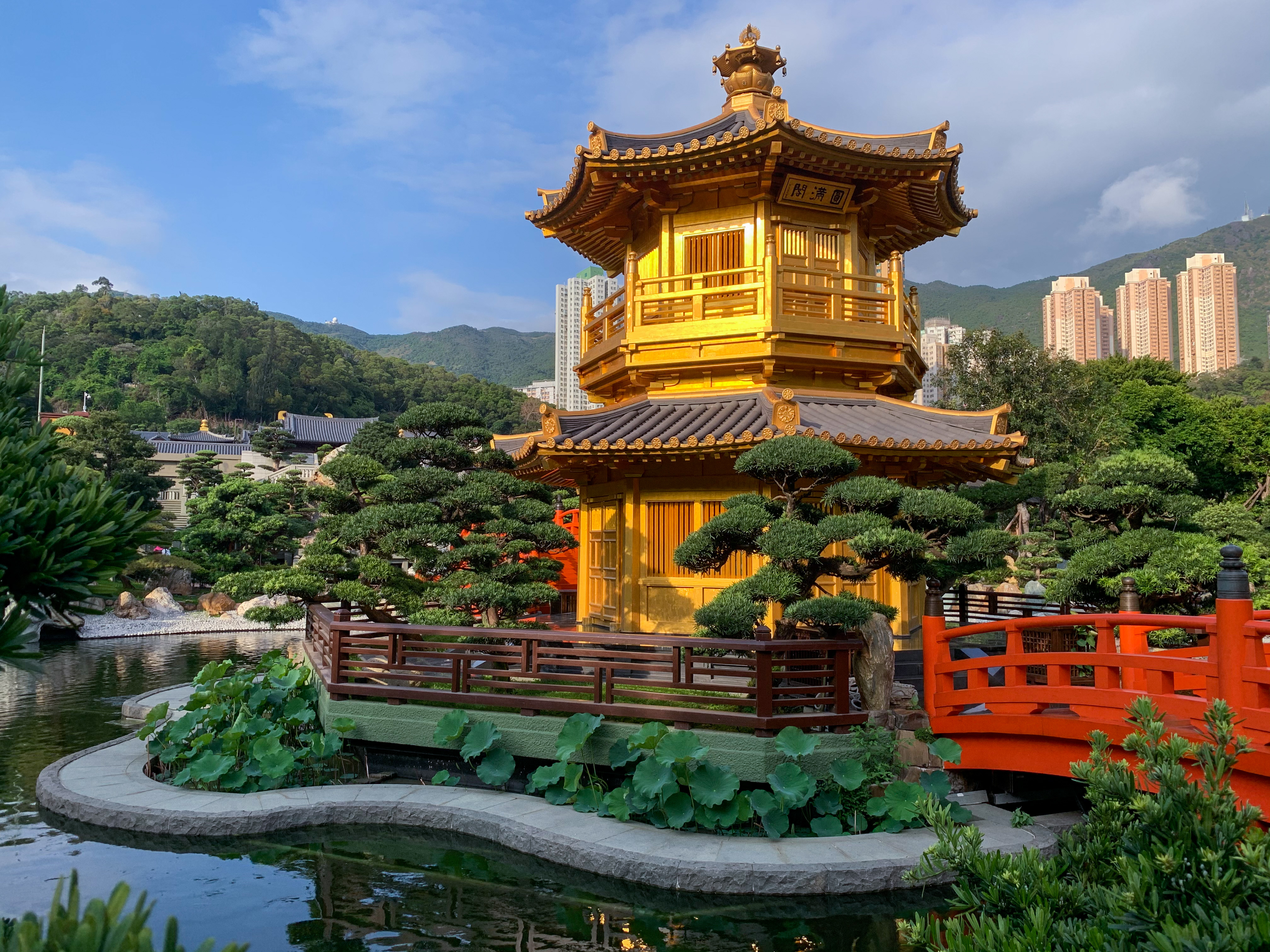 Hong_Kong_30Young woman traveler traveling into Hongkong beautiful golden teak wood pagoda at Nan Lian Garden in Hong Kong