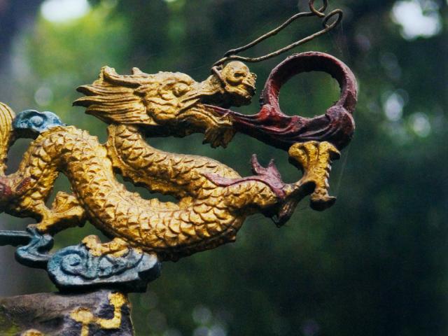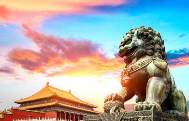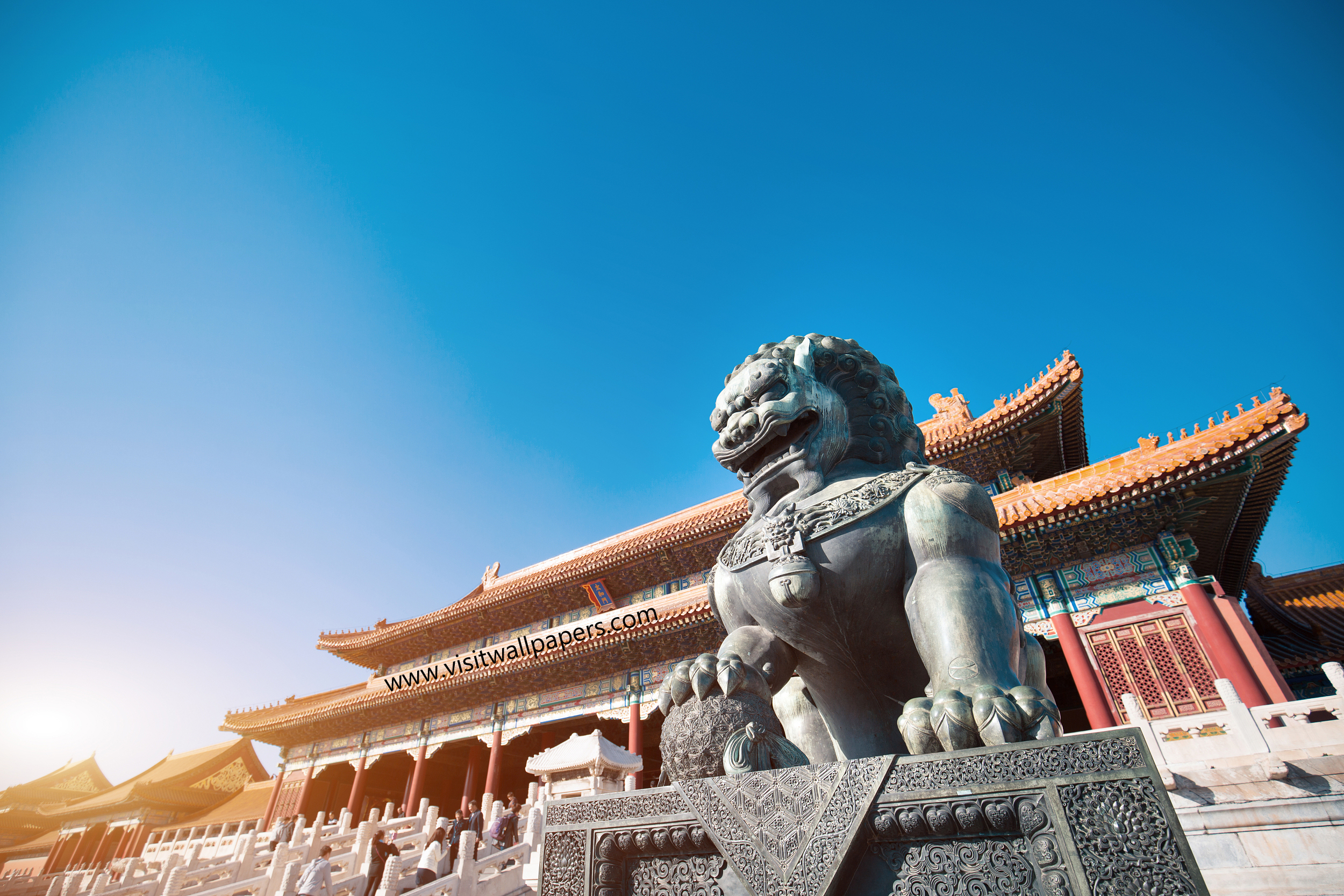 Bronze lion at the Forbidden City, Beijing, China. Chinese cultural symbols