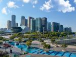 Several venues of the 2022 Hangzhou Asian Games situated on the banks of the Qiantang River in Hangzhou, Zhejiang Province, China, are captured in a photo dated July 13, 2023. From left to right are the main stadium, tennis court, gymnasium, and aquatic center, while the building on the right is the Hangzhou Century Center, the tallest building in Hangzhou.