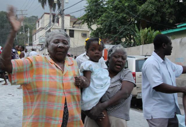 Haitians walk past damaged buildings on January 12, 2010 in Port-au-Prince Haiti after a huge earthquake. (LISANDRO SUERO/AFP/Getty Images)