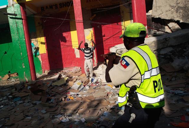 A Haitian police officer points a rifle at a man during a looting spree in the downtown business district on January 17, 2010 in Port-au-Prince, Haiti. (Chris Hondros/Getty Images)