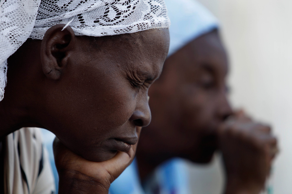 haiti_sixdayslater_038Women pray during Mass held outside the city's main Cathedral in Port-au-Prince, Sunday, Jan. 17, 2010. About one hundred people celebrated Mass Sunday morning just outside the Cathedral, which was totally destroyed in Tuesday's earthquake. (AP Photo/Greg