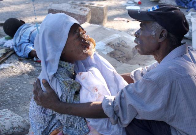Skin peels away from a badly injured victim as they wait for medical assistance after an earthquake in Port-au-Prince January 13, 2010. (REUTERS/Eduardo Munoz)