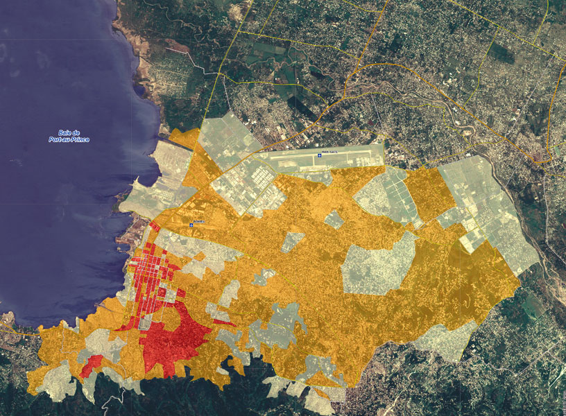 haiti_sixdayslater_052A satellite image map of Port-au-Prince represents a building damage assessment with red for obvious/widespread damage, orange for evident but sporadic damage, and light yellow for scarce or non-visible damage.