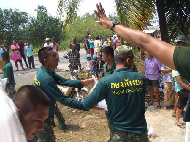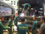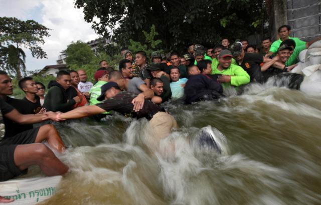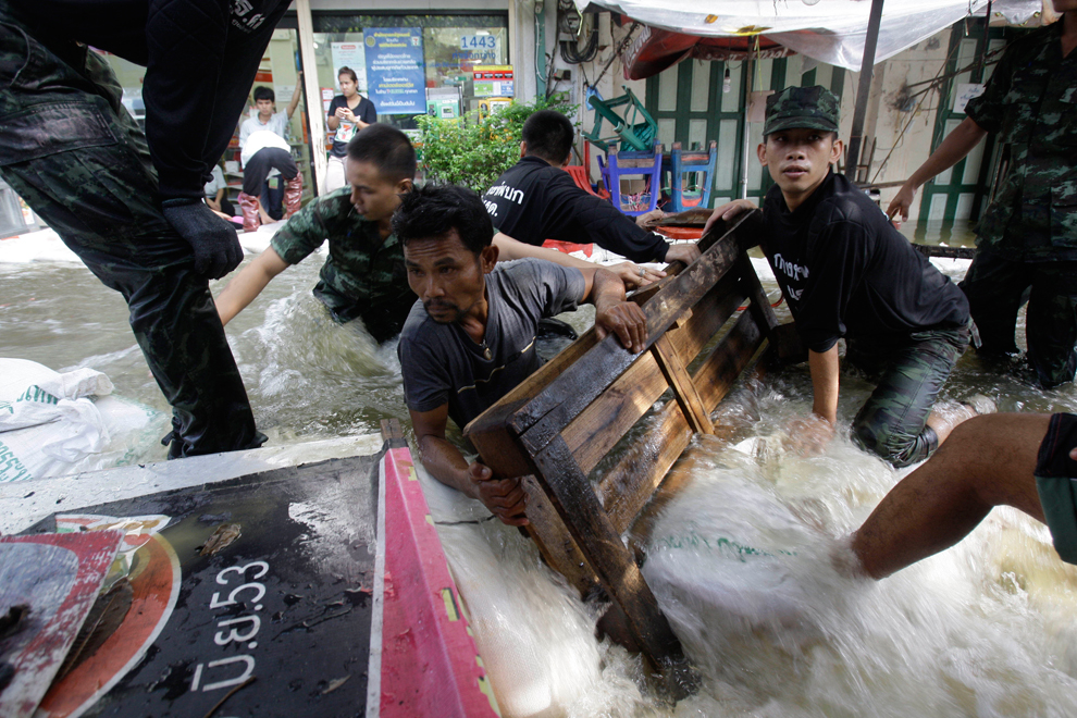 thai_flood_54_002Thai soldiers hold onto each other against the water flowing into a neighborhood after a wall was breached by the swollen Chao Phraya River in Bangkok on October 30, 2011.