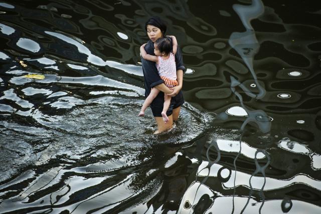 thai_flood_54_001A woman holds a toddler as she walks through floodwaters in an area near the Chao Praya river in Bangkok on October 29, 2011.