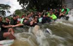Thai soldiers hold onto each other against the water flowing into a neighborhood after a wall was breached by the swollen Chao Phraya River in Bangkok on October 30, 2011.