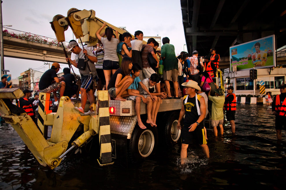 thai_flood_54_004Thai residents are transported out of a flooded street close to the Chao Phraya river on October 30, 2011 in Bangkok. (Daniel Berehulak /Getty Images)