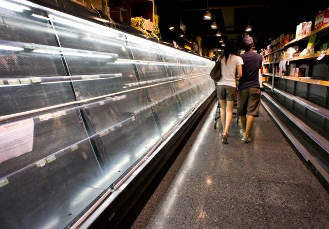 thai_flood_54_005A Thai couple push a cart by the empty shelves inside a supermarket whose suppliers were affected by flooding in Bangkok on October 29, 2011. (Andy Wong/AP)