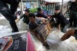 People push their belongings through floodwaters during an evacuation from a flooded market in Bangkok October 24, 2011. (Sukree Sukplang/Reuters)