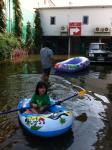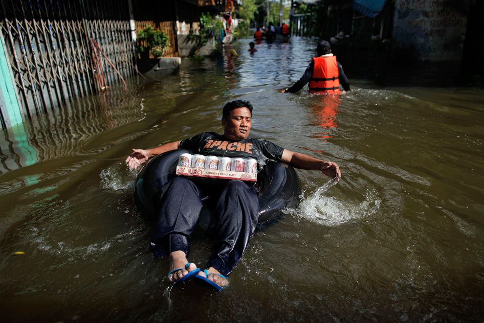 thai_flood_54_011A man floats on a truck tire with supplies of beer as floods advance into central Bangkok on October 26, 2011. (Damir Sagolj/Reuters