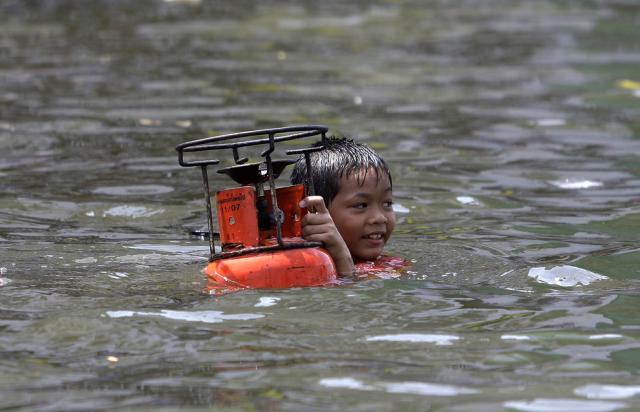 thai_flood_54_012A Thai child carries a gas tank through floods in Rangsit district on the outskirts of Bangkok on October 21. Children make up around a quarter of the nearly 800 deaths the United Nations has tallied since July across Thailand, Cambodia, Vietnam, Laos and