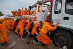 thai_flood_54_014Thai Dhammakaya monks push a truck, stuck in mud, as they work to fortify the flood gate at Khlong Rapi Pat on October 25, 2011 in Khlong Luang, on the outskirts of Bangkok. (Daniel Berehulak/Getty Images)