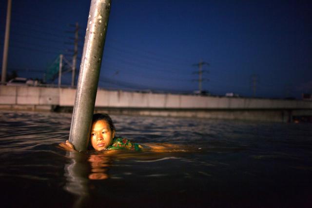 thai_flood_54_015A woman hangs onto a street sign in chest-deep water on October 24, 2011 in Rangsit on the outskirts of Bangkok. (Paula Bronstein/Getty Images)