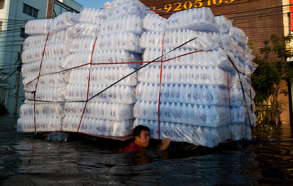 thai_flood_54_016A man with bottles of water wades down a flooded street on October 24, 2011 in Bangbuathong, Thailand. (Daniel Berehulak/Getty Images)