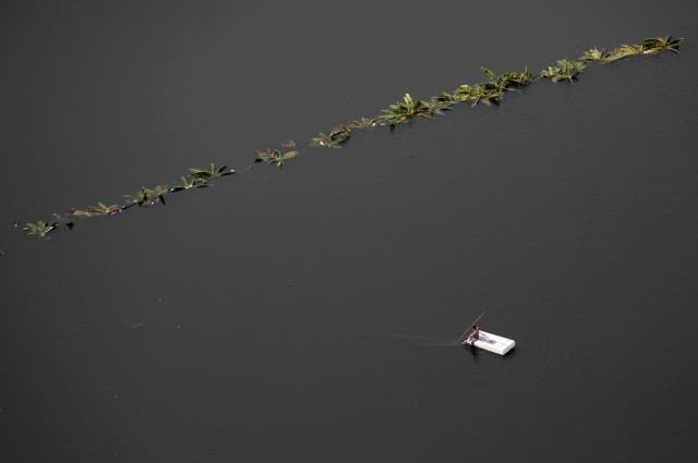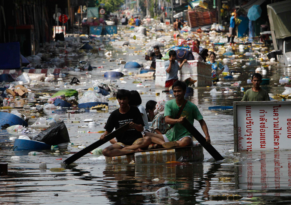 thai_flood_54_025A man paddles a makeshift raft through a flooded area in the suburbs of Bangkok October 20, 2011. (Damir Sagolj/Reuters)