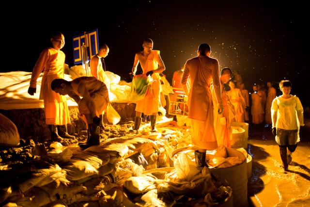 thai_flood_54_019Thai Dhammakaya monks and volunteers work to fortify the flood gate made of sandbags and pipes at Klong Rapi Pat on October 23, 2011 in Klong Luang on the outskirts of Bangkok. (Daniel Berehulak/Getty Images)