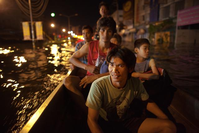 thai_flood_54_018An exhausted man gets a boat ride to an evacuation center on a flooded street on October 23, 2011 in Bangbuathong, Thailand. (Paula Bronstein/Getty Images)