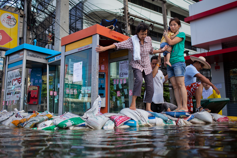 thai_flood_54_022Thai residents make their way through flooded streets across sandbags on October 22, 2011 in Pathum Thani on the outskirts of Bangkok. (Daniel Berehulak /Getty Images)