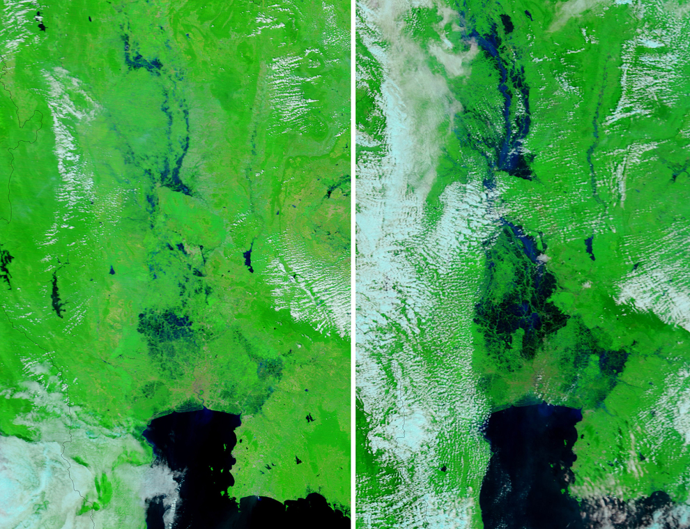 thai_flood_54_023This pair of photographs from NASA shows images from space of the Bangkok metropolitan area (lower center) taken by the Terra satellite on November 12, 2008 (left) and the same area on October 19, 2011, illustrating the flood surge north of the city. (NAS