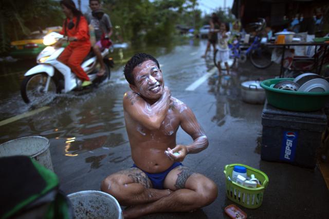 thai_flood_54_024A Thai man bathes on the street after becoming homeless when his home flooded October 21, 2011 in Pathumthani on the outskirts of Bangkok. (Paula Bronstein/Getty Images)