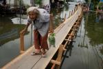 An elderly woman walks on a wooden bridge across floodwaters in Bang Bua Thon, in Nonthaburi province, suburban Bangkok, on October 18, 2011. (Nicolas Asfouri/AFP/Getty Images)
