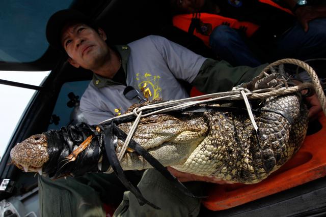 thai_flood_54_027A Thai rescue worker sits next to a crocodile caught in a flooded area in Ayutthaya province October 15, 2011. (Sukree Sukplang/Reuters)
