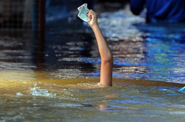 A Thai boy holds aloft banknotes to keep them dry while he swims during the flood in Nonthaburi province, suburban Bangkok, on October 15, 2011. (Pornchai Kittiwongsakul/AFP/Getty Images)