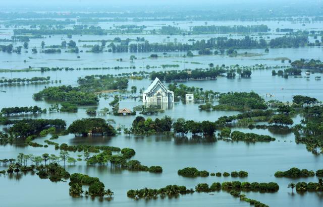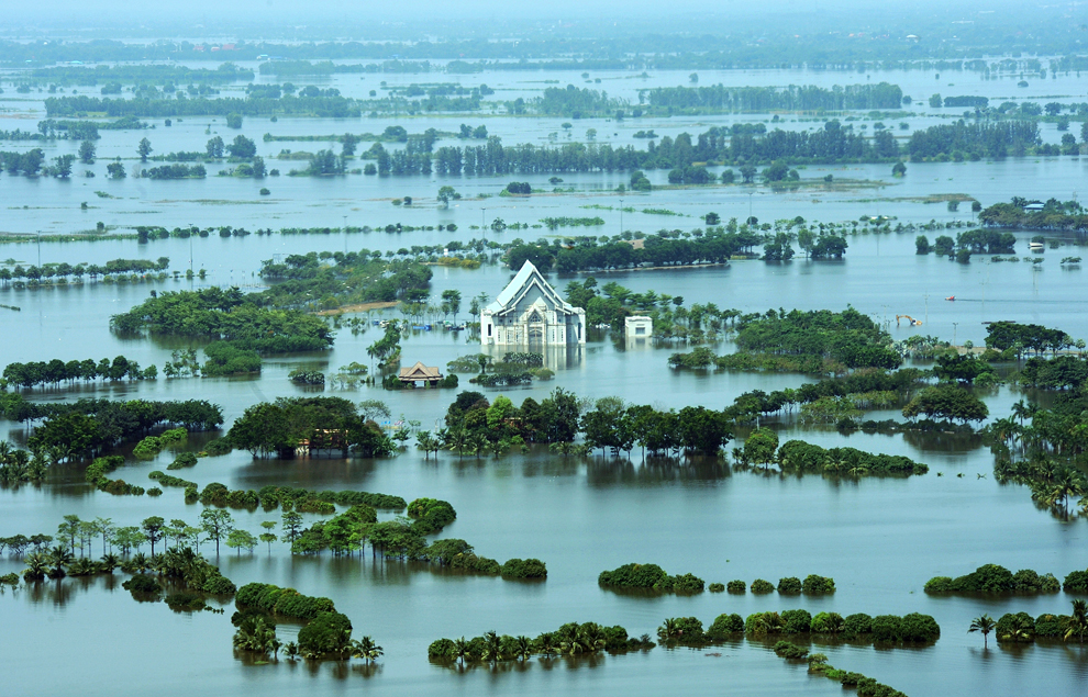 thai_flood_54_030This aerial picture shows an under-construction temple surrounded by floodwaters outside the ancient Thai capital of Ayutthaya, north of Bangkok on October 11, 2011. (Christophe Archambault/AFP/Getty Images)