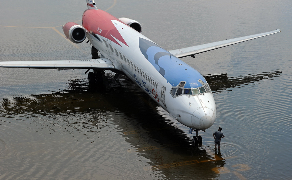 thai_flood_54_035A Thai worker looks at an aircraft parked in floodwaters at Don Muang airport in Bangkok on October 27, 2011. (Pornchai Kittiwongsakul/AFP/Getty Images)
