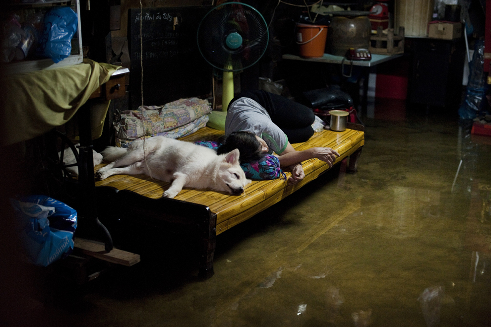 thai_flood_54_038A resident sleeps with her dog on an elevated bed that stands in the floodwaters in Chinatown near the Chao Praya river in Bangkok on October 27, 2011. (Nicolas Asfouri/AFP/Getty Images)
