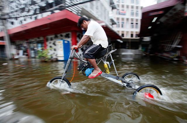 thai_flood_54_040A flood victim rides through the water using a homemade tall three-wheeler in Bang Phlad district, Bangkok on October 30, 2011. (Bazuki Muhammad/Reuters)