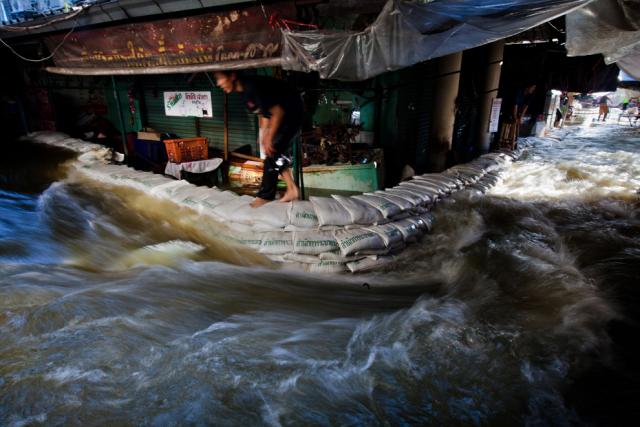 thai_flood_54_041A man walks along sandbags as flood waters rush through a market near the overflowing Chao Phraya river on October 29, 2011 in Bangkok. (Daniel Berehulak/Getty Images)