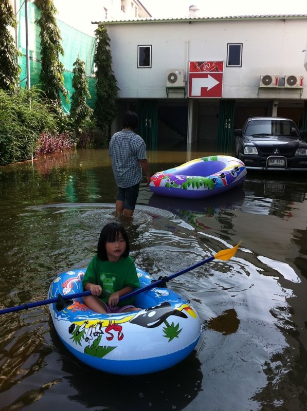 thai_flood_54_020A family floats back on a handmade raft to their house (seen behind) on October 23, 2011 in Klong Luang, on the outskirts of Bangkok. (Daniel Berehulak /Getty Images)