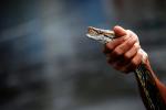 Motorcycle taxi driver Chatchawal Phuengwut holds a python he caught in floodwaters just outside the Grand Palace in Bangkok October 28, 2011. (Damir Sagolj/Reuters)