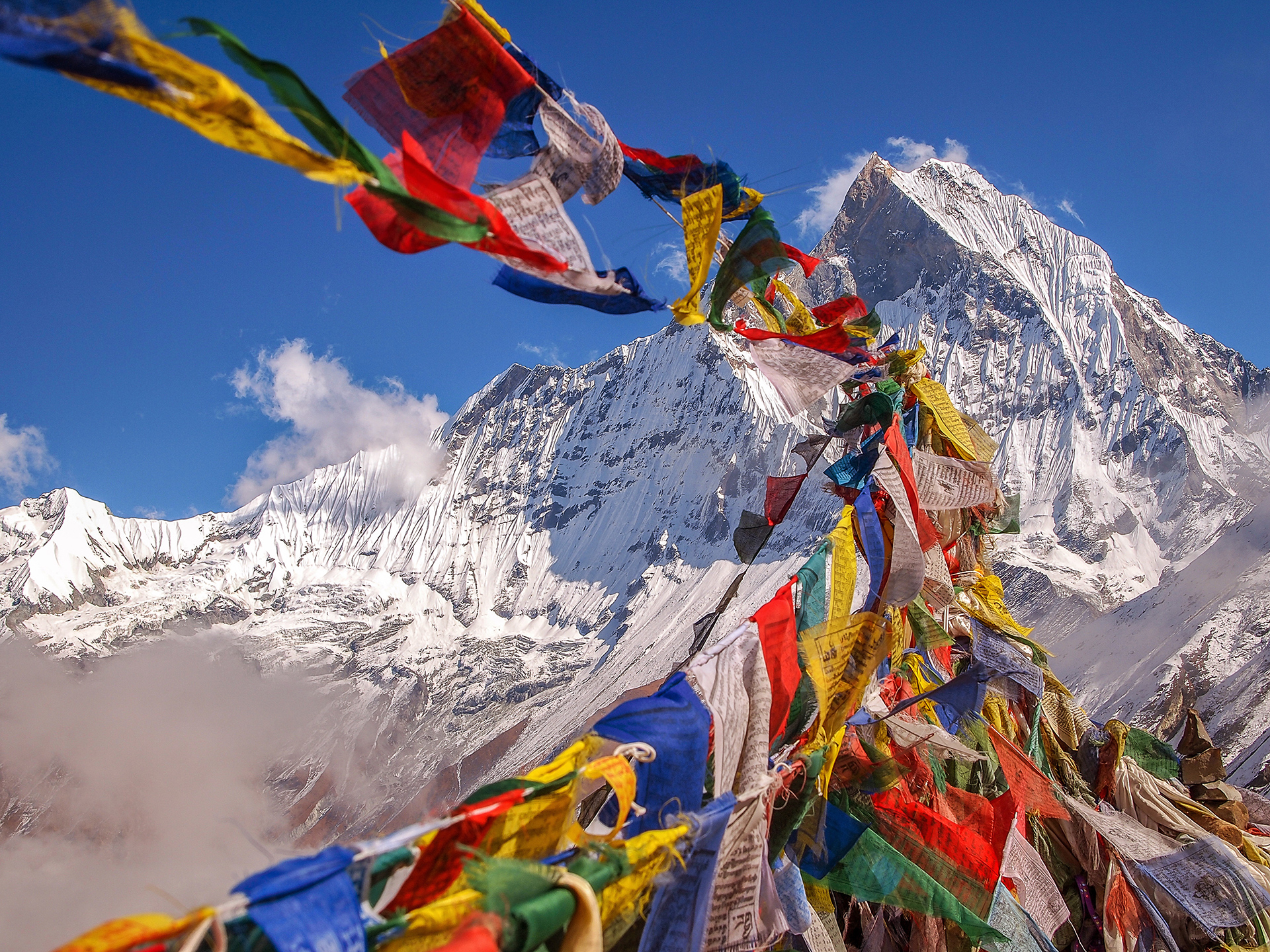 nepal_093Prayer flags and Mt. Annapurna I background from Annapurna Base Camp, Nepal.
