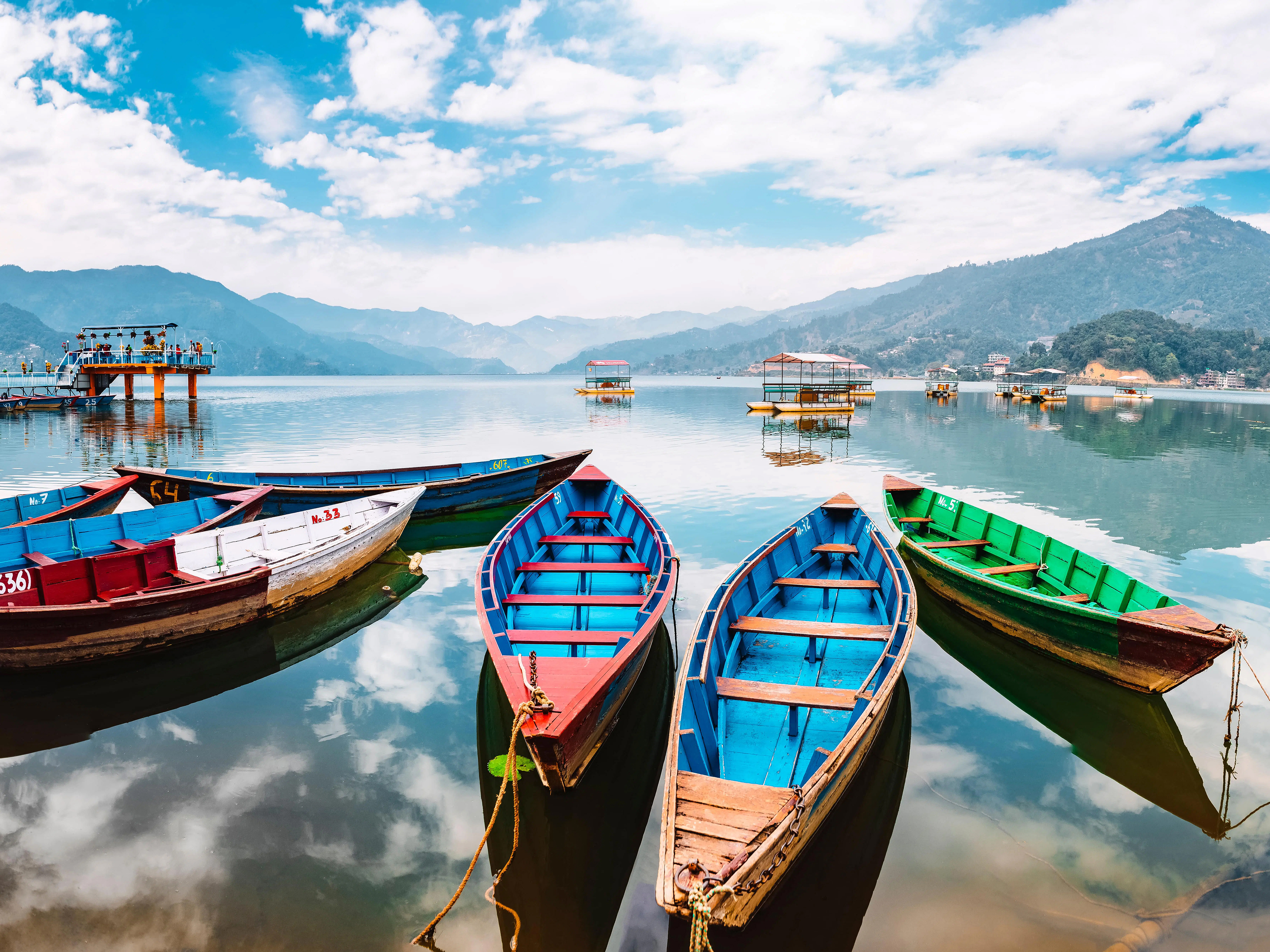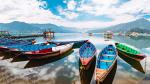 nepal_155Colourful boats at shore of beautiful Phewa lake. Pokhara, Nepal with Annapurna range in background.