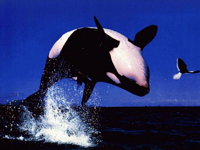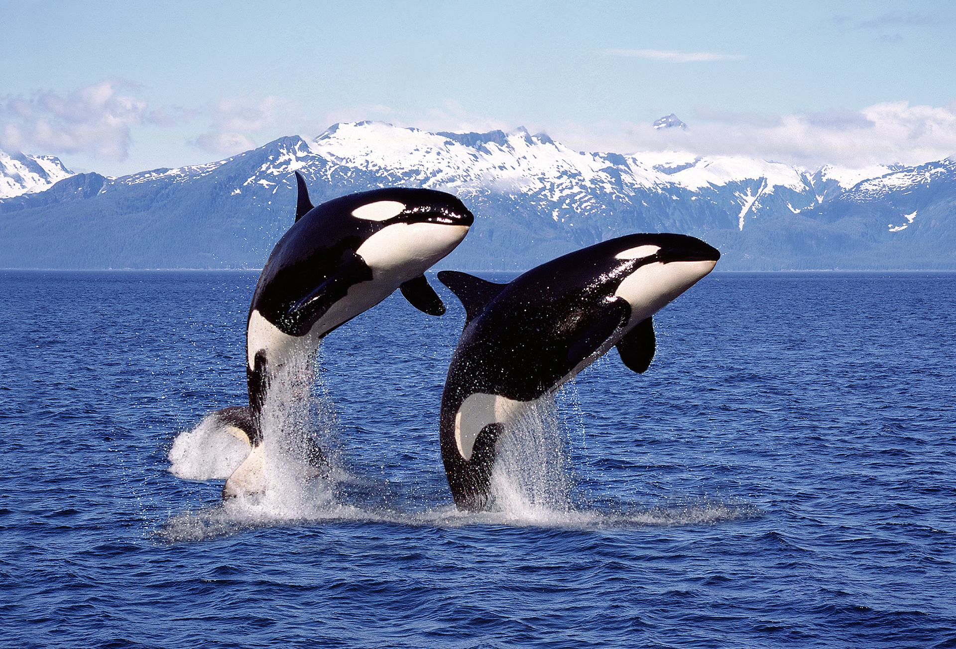 ocean-life-797Killer whale, known as Orca, jumping out of sunset ocean water with splashes, Norwegian fjord in the background