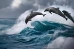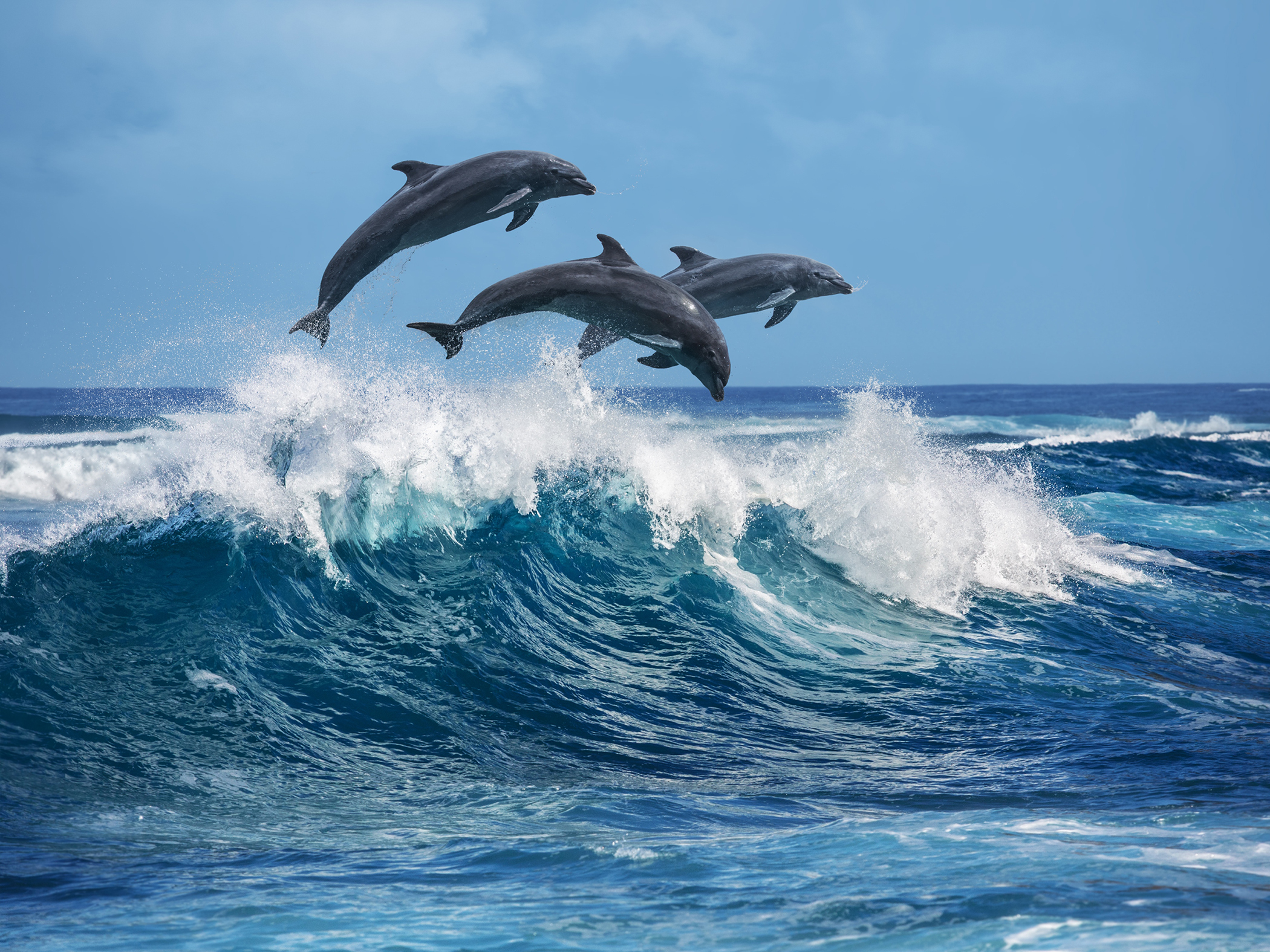 ocean-life-749Three beautiful dolphins jumping over breaking waves. Hawaii Pacific Ocean wildlife scenery. Marine animals in natural habitat.
