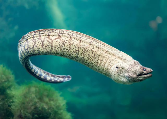 As the name suggests, the giant moray is a large eel, reaching up to 3 m (9.8 ft) in length and 30 kg (66 lb) in weight. Its elongated body is brownish in color. While juveniles are tan in color with large black spots, adults have black specks that grade into leopard-like spots behind the head.