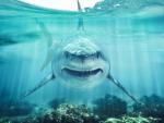 ocean-life-816Ocean shark bottom view from below. Open toothy dangerous mouth with many teeth. Underwater blue sea waves clear water shark swims forward