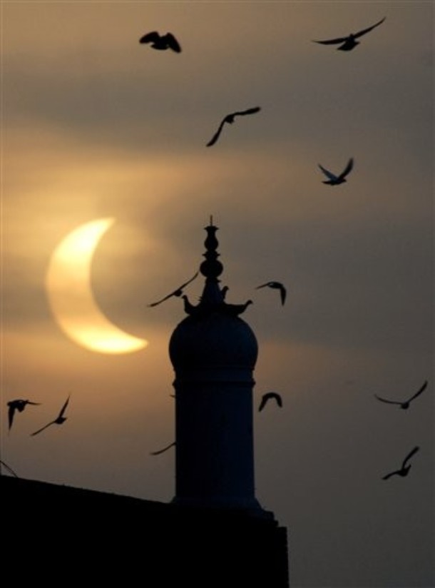 A partial solar eclipse silhouettes birds surrounding a minaret of the shrine of Sufi Saint Bah-ud-din Zakria in Multan, Pakistan on Wednesday, July 22, 2009. The longest solar eclipse of the 21st century pitched a swath of Asia into near-darkness after dawn, as millions watched the once-in-a-lifetime phenomenon Wednesday.