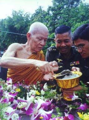 หลวงตามหาบัวถือปูนผสมทรายและน้ำพระพุทธมนต์ด้วยเกียง