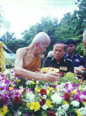 หลวงตามหาบัวโปรย ข้าวตอกดอกไม้ เหรียญเงินและเหรียญทองลงในหลุมศิลาฤกษ์